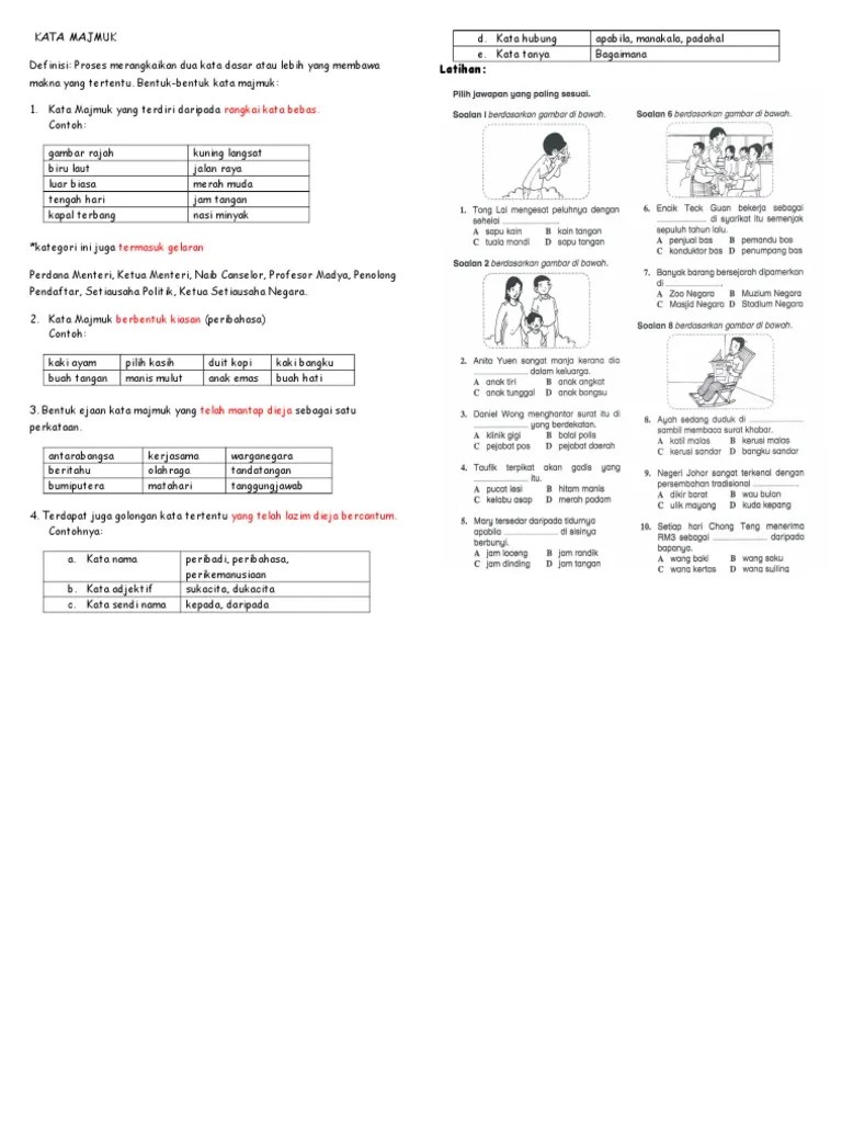 Ulangtahunx ulang tahun/ memanfaatx memanfaatkan/. Kata hubung di gunakan untuk menghubungkan ayat majmuk menjadi ayat tunggal. (membaca buku dia di perpustakaan.) 3. Kata sendi menunjukkan perkaitan antara satu perkataan/frasa dengan perkataan/frasa yang lain. Feb 28, 2020 · kata majmuk. Dec 12, 2020 · 1.1.1 (ii) • bimbing murid mendengar dan mengecam sebutan ayat majmuk. Haiwan kesayangan saya anis memelihara seekor kucing. Membaca pra sekolah & tahun 1; Kata nama am sebagai subjek. Buku di pejabat (kata nama + kata sendi + kata nama); •bagi ayat pasif kata ganti diri pertama dan kedua, kata ganti nama hendaklah hadir sebelum kata kerja pasif. Latihan kata majmuk dan rangkai kata setara. Jan 30, 2020 · kata majmuk. Kata majmuk yang telah mantap. Setiap malam.) kata kerja dengan objek 1. Menyelam sambil minum air (kata kerja + kata sendi + frasa kerja);